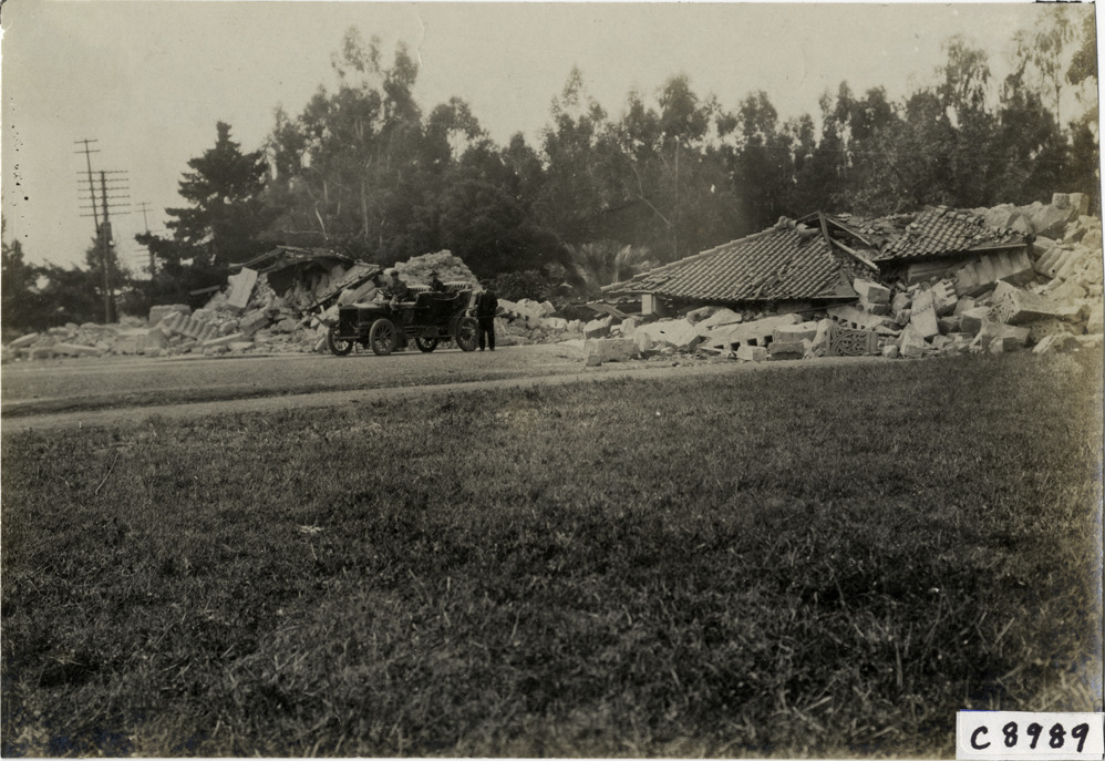 View of car parked in front of collapsed entrance gate to Stanford University in Palo Alto during aftermath of 1906 earthquake and fire in San Francisco, California. Stamped on back: "Photo by N. Lazarnick, 29 West 42nd Street, New York." Handwritten on back: "Earthquakes--San Francisco, 1906. Entrance to Sanford [sic] University."