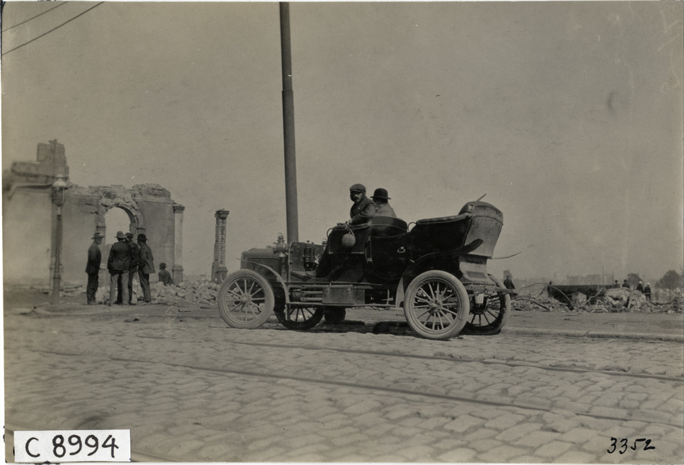 Automobile parked in front of damaged buildings, 1906 San Francisco earthquake and fire