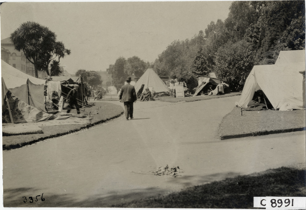 Man walking through relief camp, 1906 San Francisco earthquake and fire