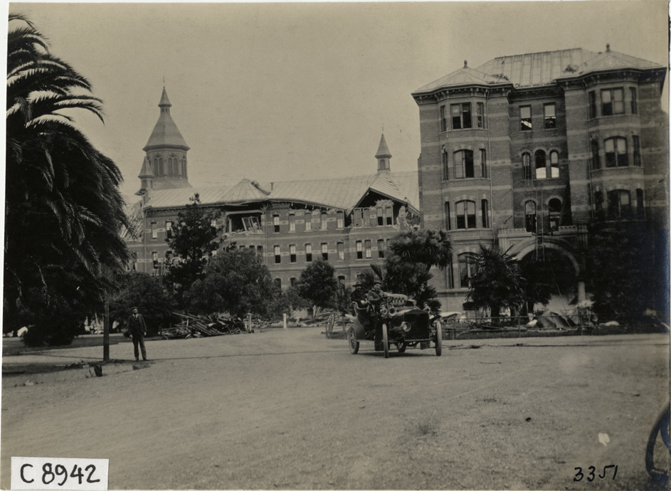 View of damage to Agnews Insane Asylum in Santa Clara during aftermath of 1906 earthquake and fire in San Francisco, California. Two men in car in foreground. Handwritten on back: "Earthquakes--San Francisco, 1906."