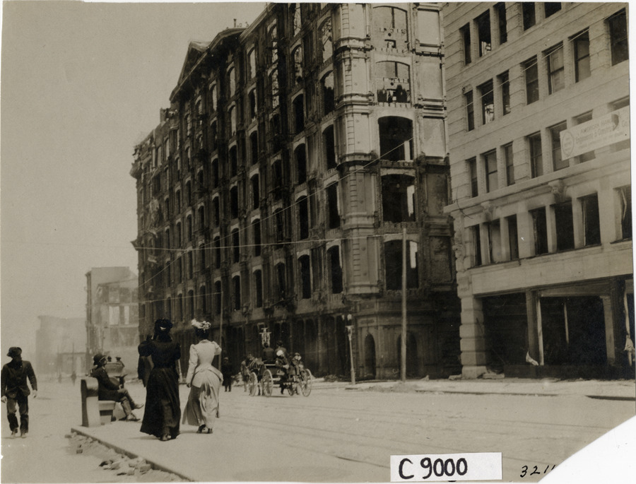 View of pedestrians and horse-drawn wagon near damaged Palace Hotel during aftermath of 1906 earthquake and fire in San Francisco, California. Stamped on back: "Photo by N. Lazarnick, 29 West 42nd Street, New York." Handwritten on back: "Earthquakes--San Francisco, 1906. Palace Hotel."