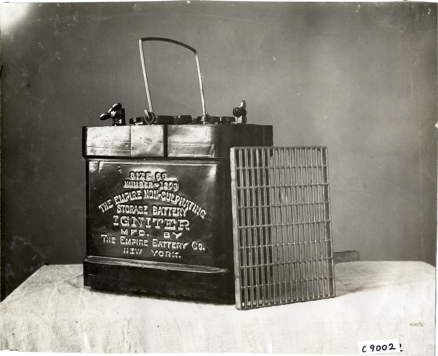 Favorite this☆ Empire battery Description: View of Empire battery for car. Stamped on side of battery: "Size 66, number 1203, the Empire non-sulphating storage battery ignitor, mfd. by the Empire Battery Co., New York." Handwritten on back: "Electrical--Empire battery, 1908." Details Resource ID: na006680 Subject: Automobiles--Batteries Photographic prints Date Issued: 1908 Format: 1 photographic print ; 7.75 x 9.5 in. Member of: National Automotive History Collection Lazarnick Collection Filing Location: Electrical Negative Number: Negative #C9002 Rights: Physical rights are retained by DPL. Copyright is retained in accordance with U.S. copyright laws.