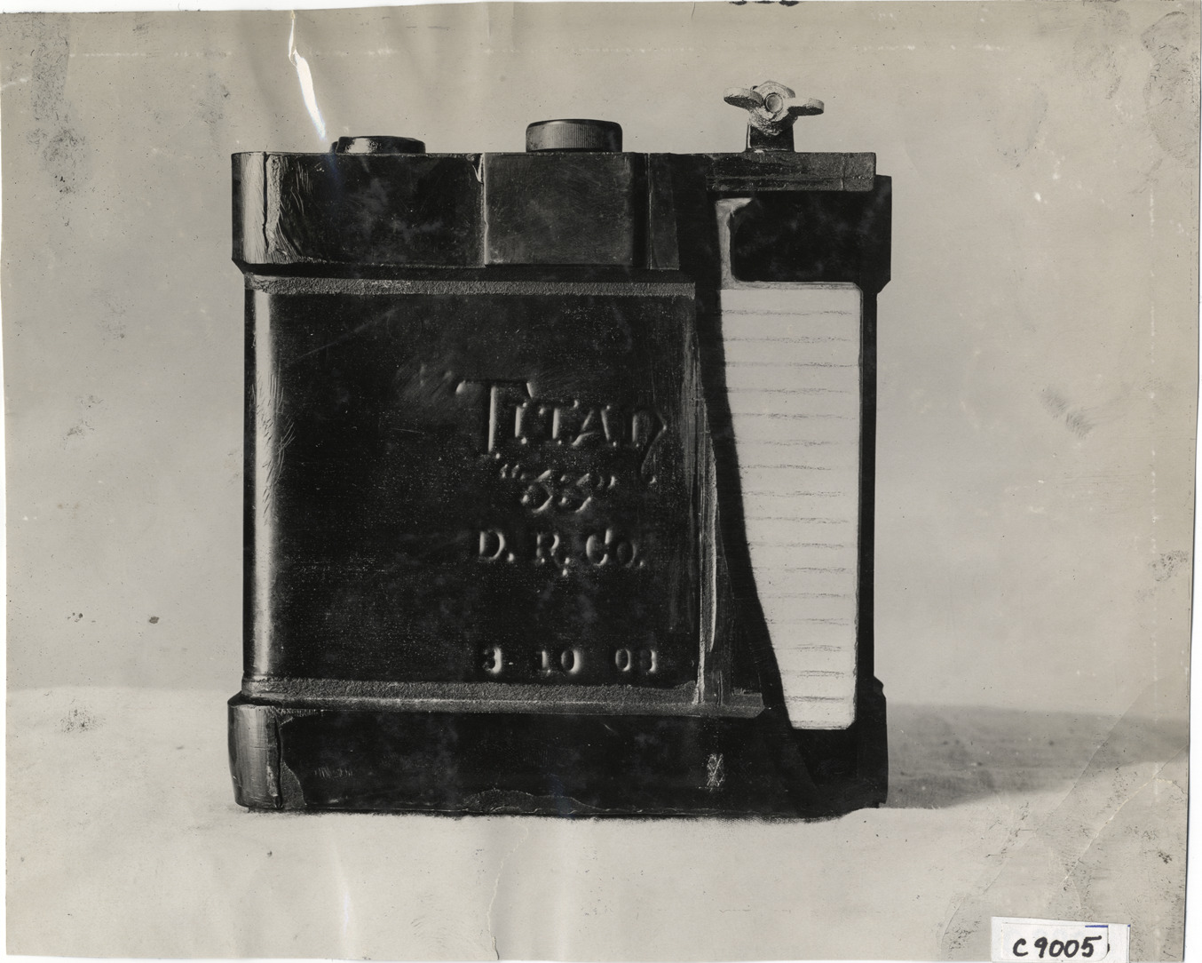 View of Titan battery for car. Stamped on side of battery: "Titan '33' D R Co., 8-10-08." Stamped on back: "Spooner and Wells, 1931 Broadway, New York, duplicates any time, enlargements all sizes, tel. 3472-3473 Col., credit appreciated." Handwritten on back: "Electrical--Titan battery, 1908."