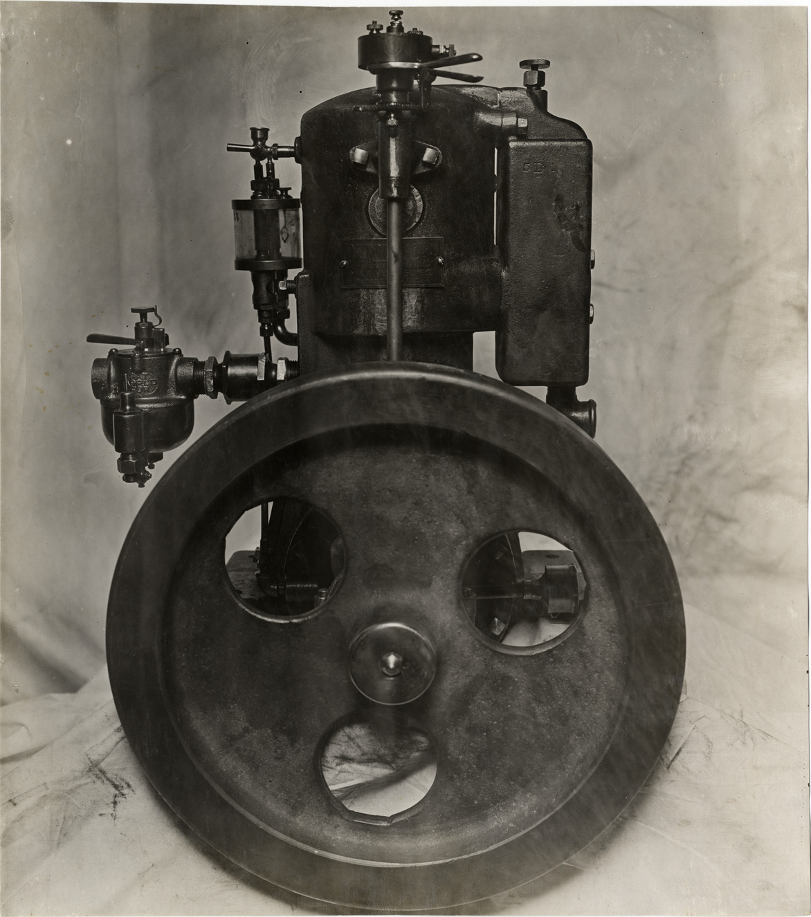 View of Detroit Engine Works marine engine. "Detroit Engine Works, builders of marine engines, Detroit, U.S.A." on plate affixed to engine. Handwritten on back: "Engines--Detroit, 1910."