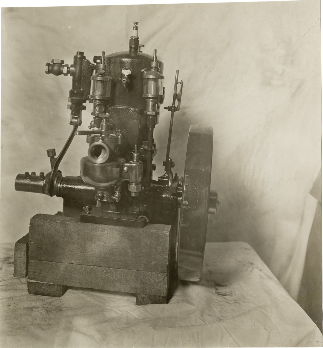 View of Detroit Engine Works marine engine. Stamped on back: "Spooner & Wells, Inc., photographers, telephone North 1745. 1231 Woodward Ave., Detroit, Mich. Detroit, 1231 Woodward, New York, 1931 Broadway." Handwritten on back: "Engines--Detroit, 1910. Mich. Steel Boat Co."
