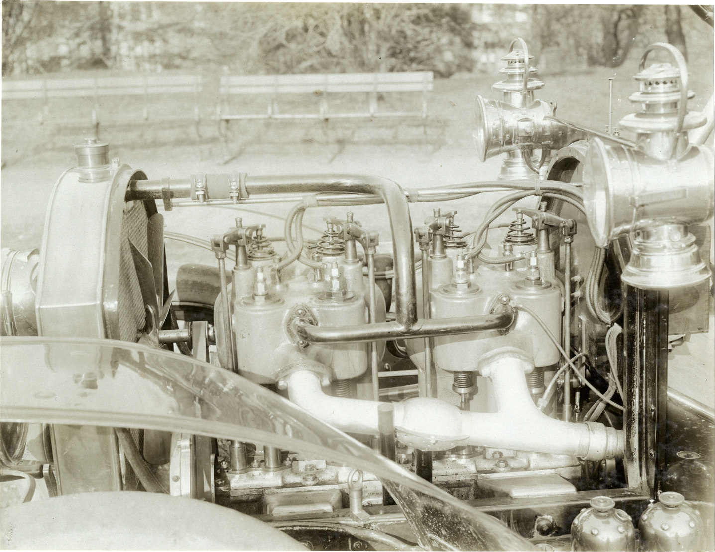 Close-up view of Walter engine for car. Stamped on back: "Photo by F. Ed. Spooner, 1536 B'way, telephone 6536-38th St., New York, N.Y." Handwritten on back: "Walter engine, 1906."