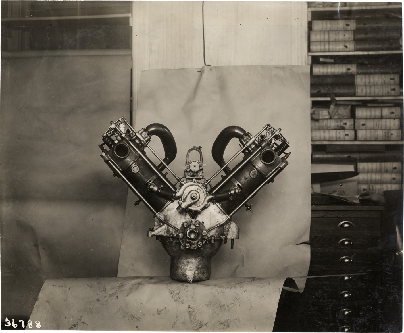 View of car engine on backdrop; bookshelves in background. Stamped on back: "Spooner & Wells, Inc., photographers, telephones 3472-3473 Columbus, 1931 Broadway, New York." Handwritten on back: "Engines--Unidentified, 1910."