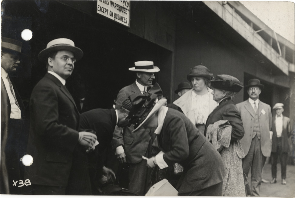 W.D. Rockwell with men and women on dock, 1913 S.A.E. summer meeting