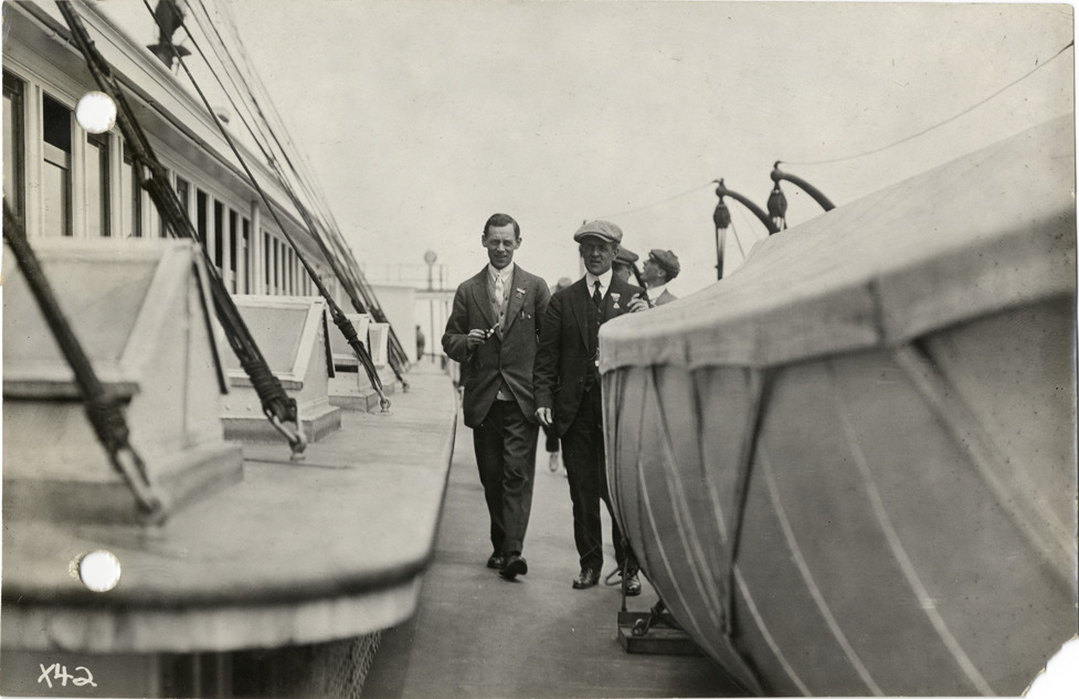 Men walking next to lifeboat on deck of the steamship City of Detroit III, 1913 S.A.E. summer meeting