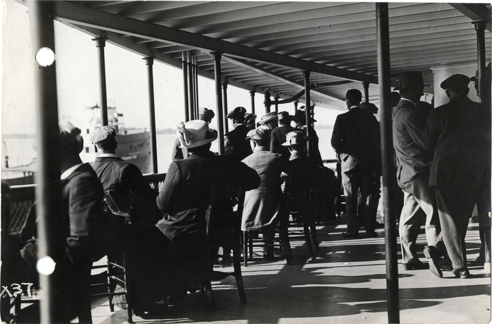 View of group of men and women watching freighter from deck of the steamship City of Detroit III during 1913 summer meeting of the S.A.E. Stamped on back: "Spooner & Wells, Inc., photographers, 1231 Woodward Ave., Detroit, Mich., telephone North 1745." Handwritten on back: "Events--Detroit S.A.E. trip. Group watching the passing of a freighter. S.A.E. trip, 1913."