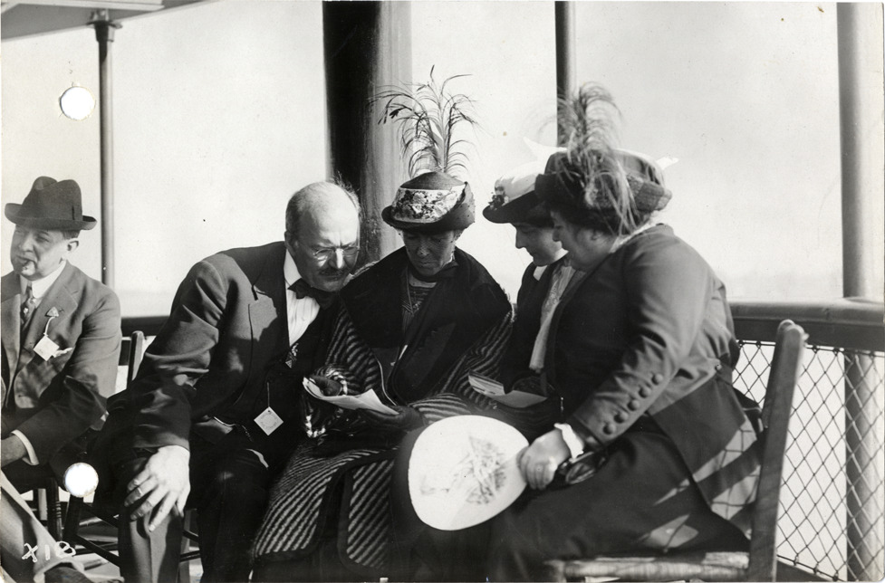 Three women and a man conversing on the steamship City of Detroit III, 1913 S.A.E. summer meeting