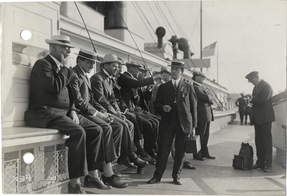 Group of men on upper deck of steamship City of Detroit III, 1913 S.A.E. summer meeting