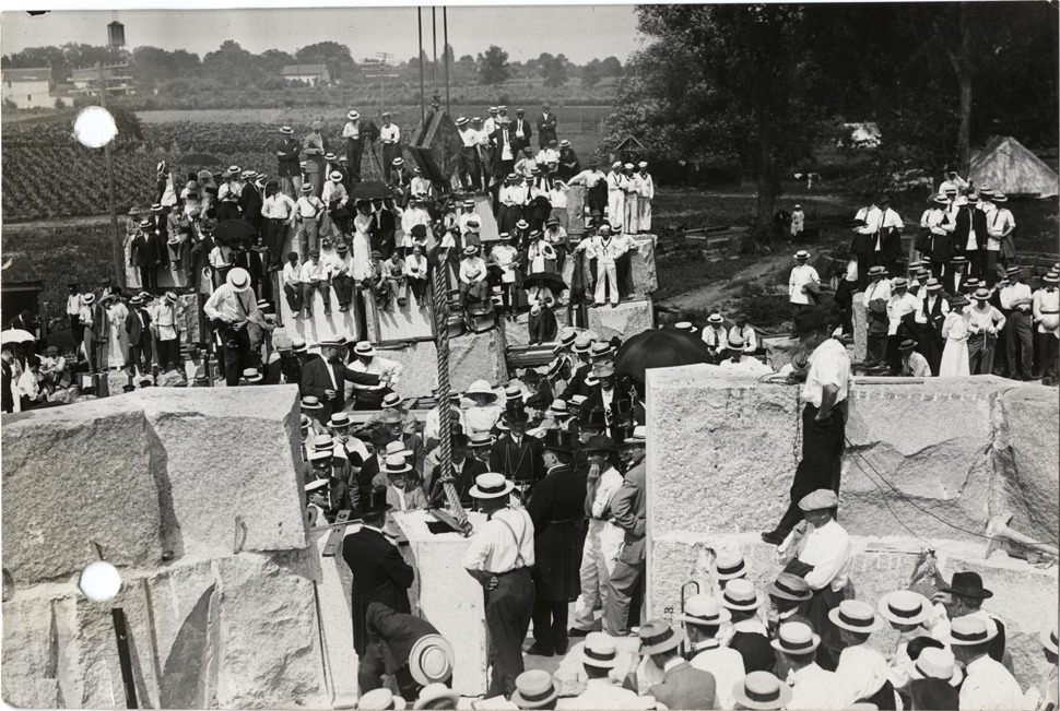View of cornerstone laying of monument at Commodore Oliver Hazard Perry Centennial celebration at Put-in-Bay, Ohio; crowd surrounds base of monument. Stamped on back: "Spooner & Wells, Inc., photographers, 1231 Woodward Ave., Detroit, Mich., telephone North 1745." Handwritten on back: "Events--Perry Centennial at Put-in-Bay."