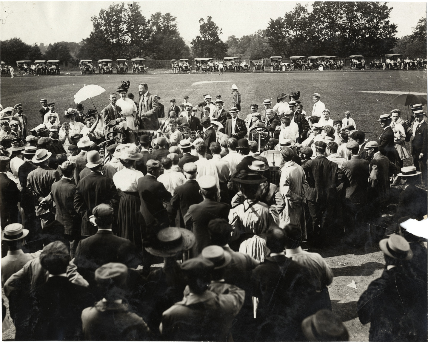 View of crowd surrounding cars at unidentified automotive event; row of cars in background. Handwritten on back: "Events--Unidentified."