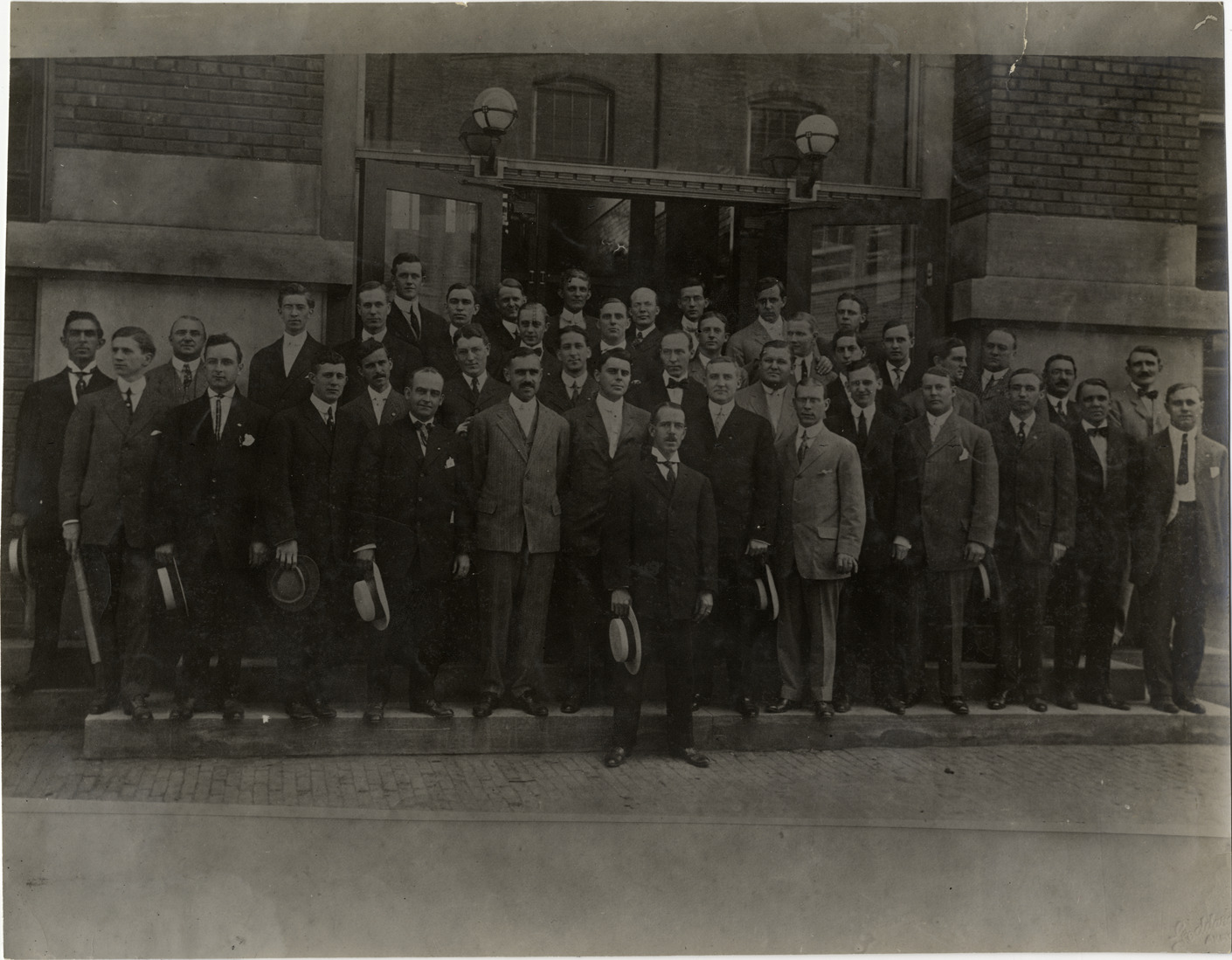 Favorite this☆ Men posing in front of building Description: Group portrait of men standing in front of building. Stamped on back: "Complimentary. No charge for this photo. Sent by order of Mnfg'r., Spooner & Wells, 1931 Broadway, New York." Handwritten on back: "Events--Unidentified, 1908." Details Resource ID: na006814 Creator: Spooner & Wells Subject: Men--Portraits Portraits, Group Photographers--New York (State)--New York Photographic prints Date Issued: 1908 Format: 1 photographic print ; 7.5 x 9.5 in. Member of: National Automotive History Collection Lazarnick Collection Filing Location: Events--Unidentified Rights: Physical rights are retained by DPL. Copyright is retained in accordance with U.S. copyright laws.