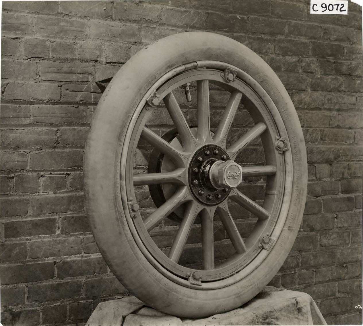 Favorite this☆ 1912 Everitt automobile wheel Description: View of wheel and tire for 1912 Everitt car. Stamped on back: "Spooner & Wells, Inc., photographers, 1231 Woodward Ave., Detroit, Mich., telephone North 1745." Handwritten on back: "Everitt, 1912." Details Resource ID: na006870 Creator: Spooner & Wells Subject: Automobiles--Wheels Automobiles--Tires Metzger Motor Car Company Photographers--Michigan--Detroit Photographic prints Date Issued: Unknown year Format: 1 photographic print ; 7.5 x 8.5 in. Member of: National Automotive History Collection Lazarnick Collection Filing Location: Everitt, 1912 #2 Negative Number: Negative #C9072 Rights: Physical rights are retained by DPL. Copyright is retained in accordance with U.S. copyright laws.