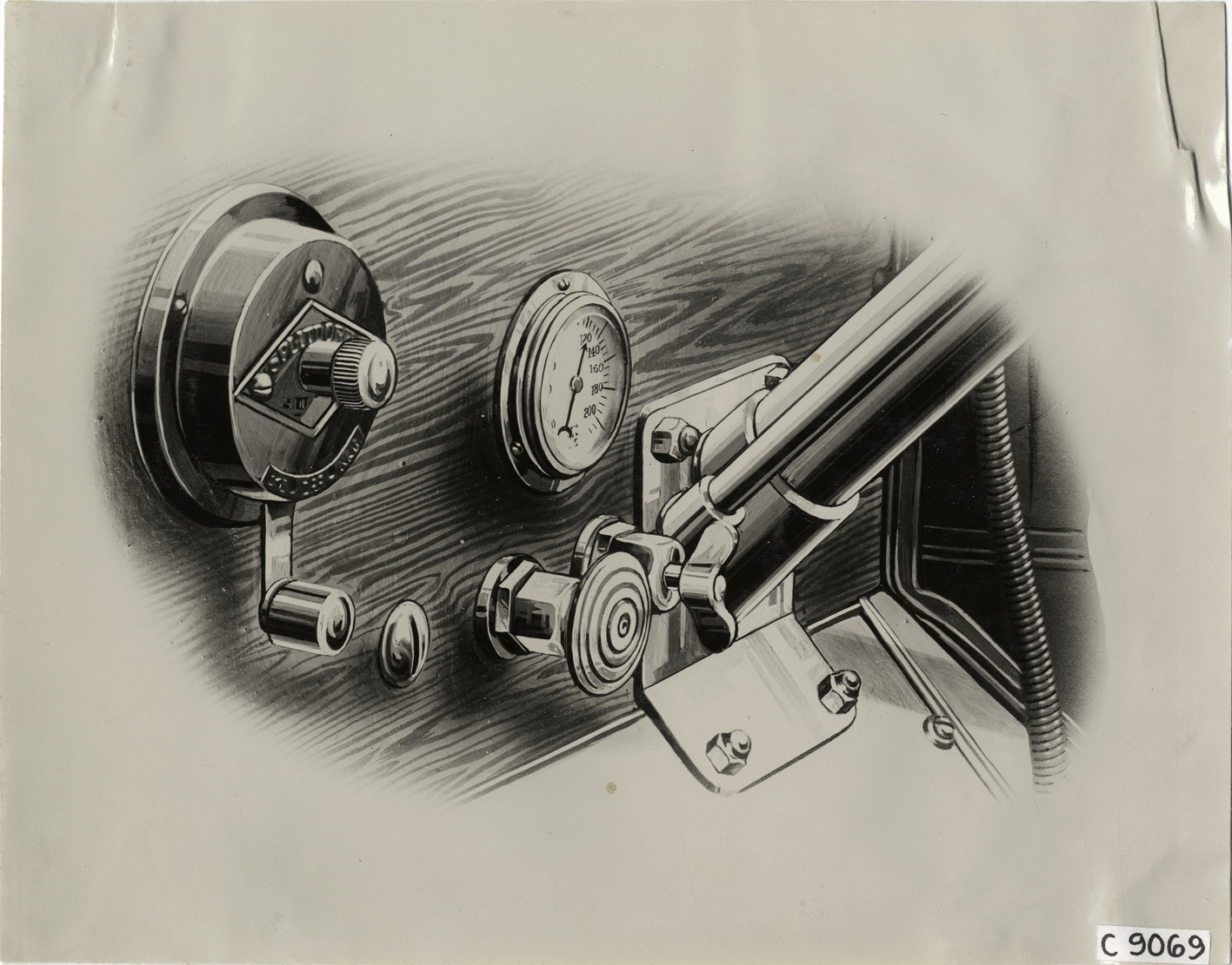 Artist's depiction of 1912 Everitt car dashboard. Handwritten on back: "Everitt, 1912."