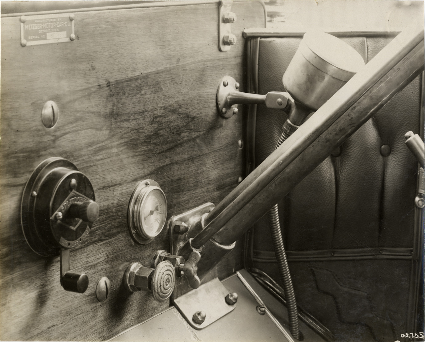 View of dashboard and steering column for 1912 Everitt car. Stamped on back: "Spooner & Wells, Inc., photographers, 1231 Woodward Ave., Detroit, Mich., telephone North 1745." Handwritten on back: "Everitt, 1912."