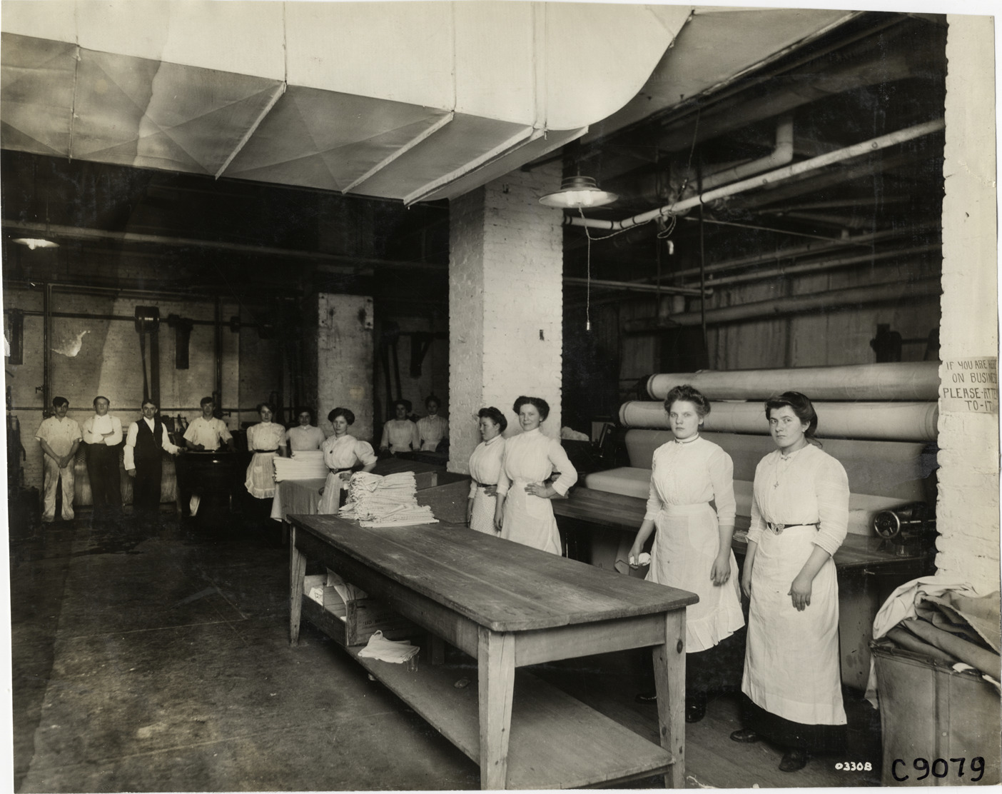 View of men and women in American Laundry Machinery Company factory; women in foreground stand behind long table. Handwritten on back: "Factories--American Laundry Machinery Co., 1911."