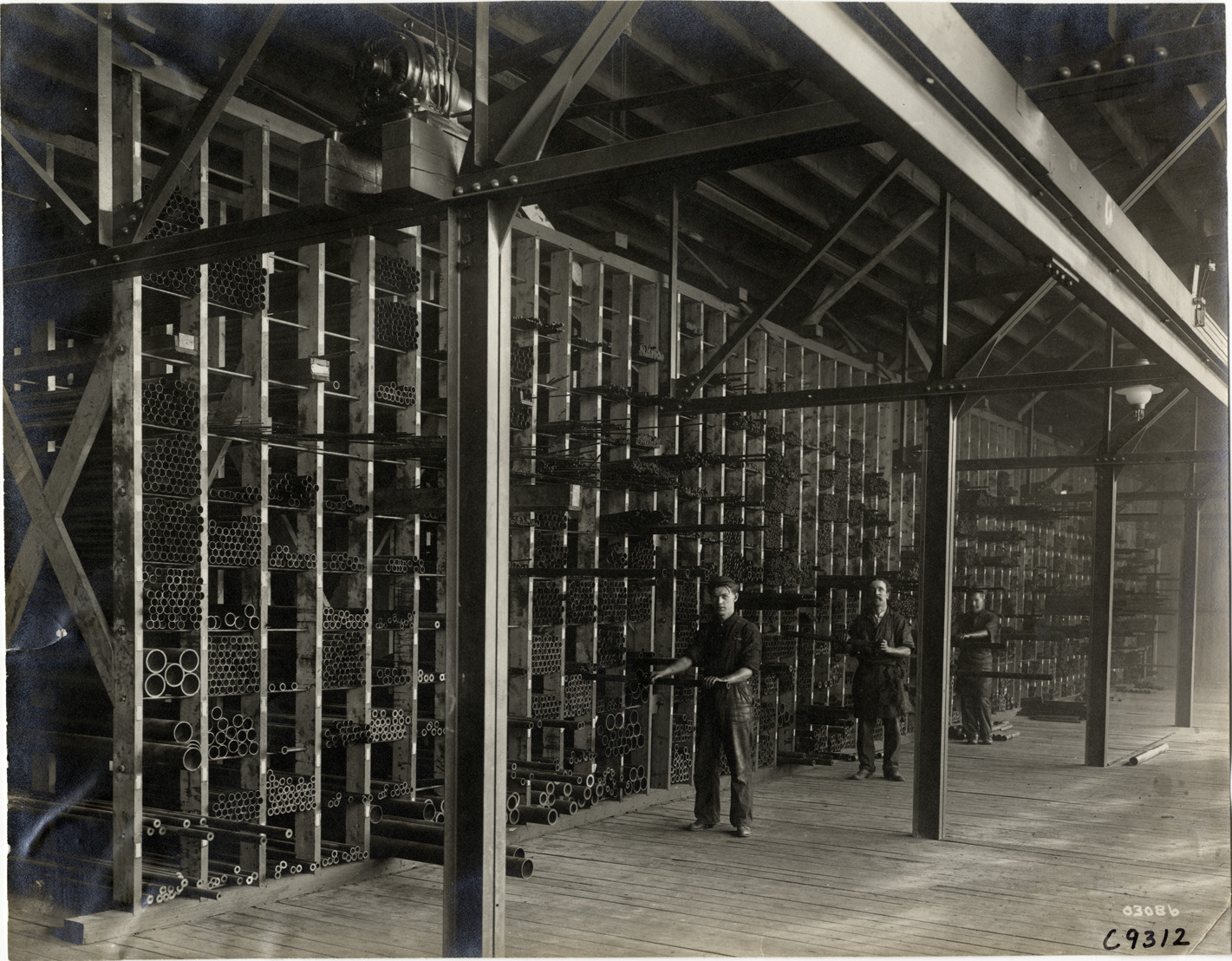 View of workers standing next to steel rods stacked in storage unit at Pittsburgh Shafting Company factory. Handwritten on back: "Factories--Pittsburgh Shafting Co., 1911."