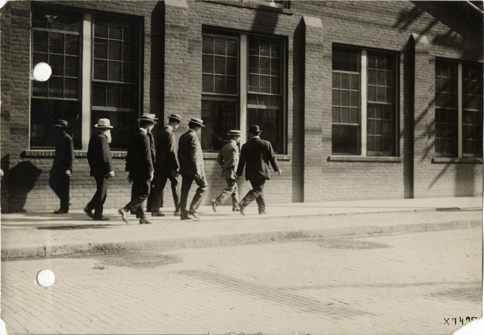View of group of men from the S.A.E., walking in front of Cadillac Motor Company factory. Stamped on back: "Spooner & Wells, Inc., photographers, 1231 Woodward Ave., Detroit, Mich., telephone North 1745." Handwritten on back: "Factories--Cadillac. S.A.E. Cadillac factory."