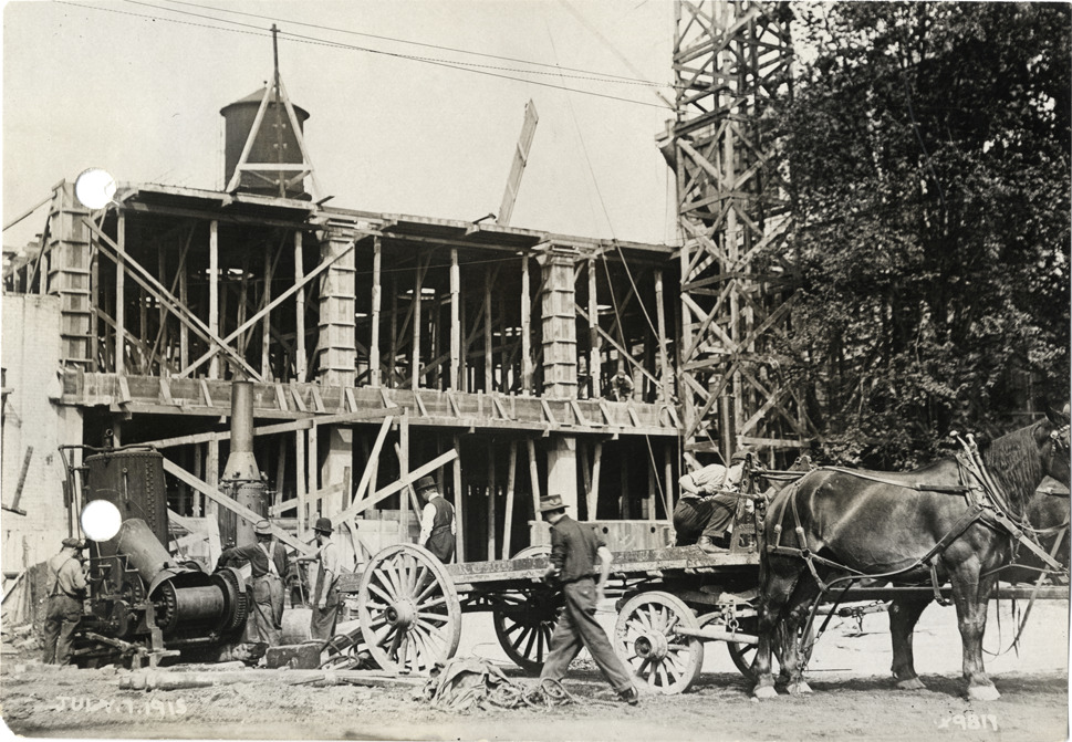 View of men working on Chalmers Motor Company factory during construction. Horse-drawn wagon and steam engine in foreground. Handwritten on front: "July 7, 1915." Handwritten on back: "Factories--Chalmers Motor Co. Taken at the Chalmers Motor Co."
