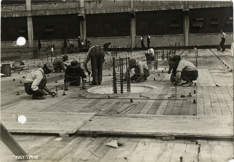 View of men working on Chalmers Motor Company factory during construction. Handwritten on front: "July 7, 1915." Handwritten on back: "Factories--Chalmers Motor Co. Taken at the Chalmers Motor Co."
