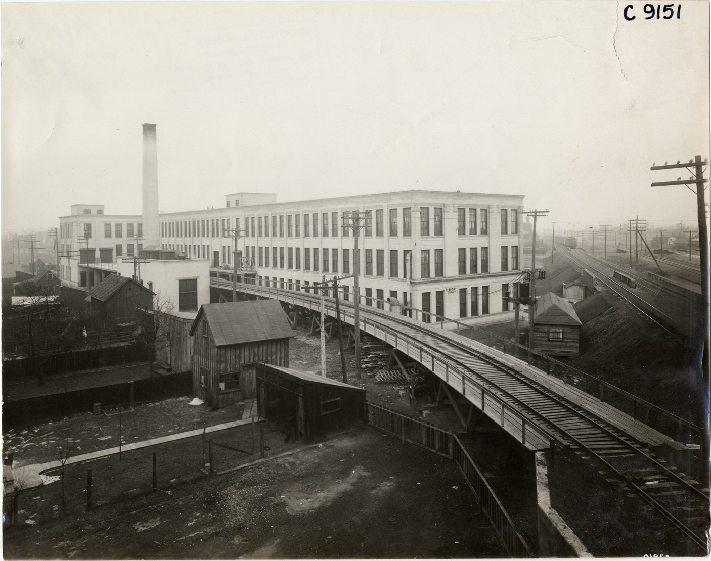 View of Corcoran Detroit Lamp Company factory; railroad tracks in foreground. Stamped on back: "Spooner & Wells, Inc., photographers, 1231 Woodward Ave., Detroit, Mich., telephone North 1745." Handwritten on back: "Factories--Corcoran Detroit Lamp Co., 1911."