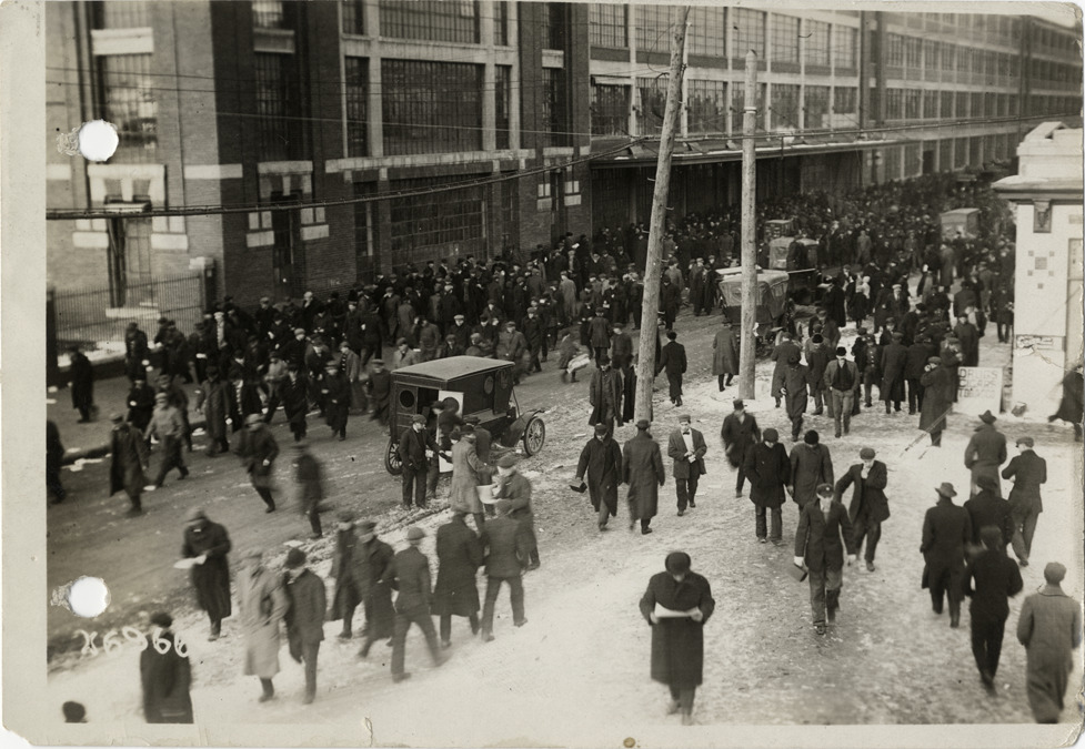 View of workers leaving Ford Motor Company factory. Stamped on back: "Spooner & Wells, Inc., photographers, 1231 Woodward Ave., Detroit, Mich., telephone North 1745." Handwritten on back: "Factories--Ford. Crowd of workmen leaving Ford Motor Co. plant at quitting time, 4:30 o'clock."