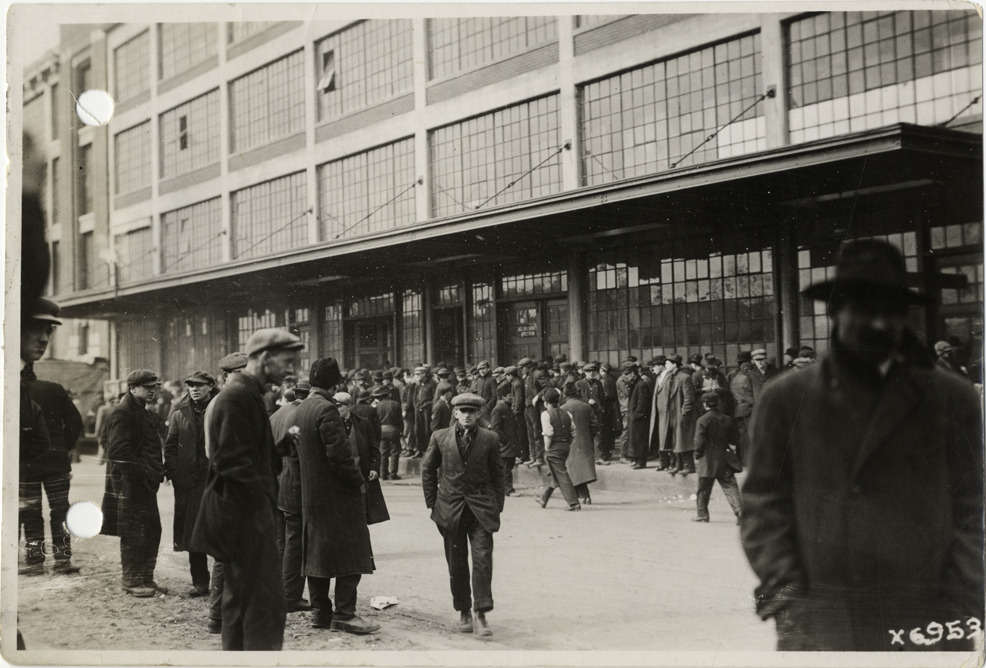 View of workers standing outside Ford Motor Company factory during noon hour. Stamped on back: "Spooner & Wells, Inc., photographers, 1231 Woodward Ave., Detroit, Mich., telephone North 1745." Handwritten on back: "Factories--Ford. Noon hour at Ford M. Co."