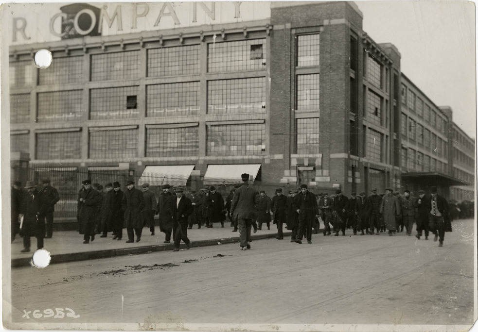 View of workers standing outside Ford Motor Company factory during noon hour. Stamped on back: "Spooner & Wells, Inc., photographers, 1231 Woodward Ave., Detroit, Mich., telephone North 1745." Handwritten on back: "Factories--Ford. Noon hour at Ford Motor Co."