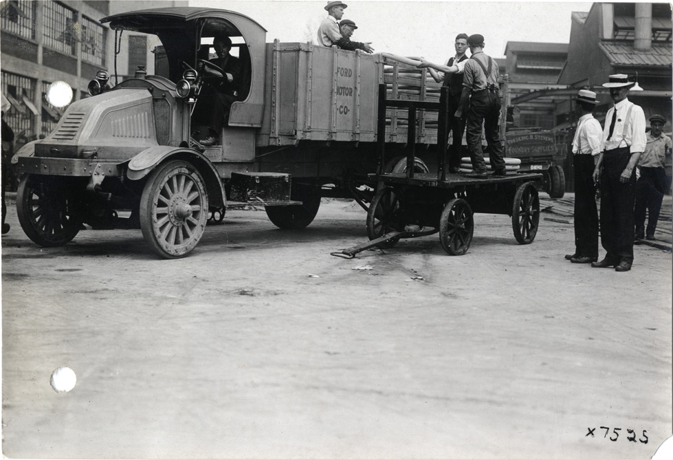 View of men unloading tires from Kelly-Springfield truck at Ford Motor Company factory. "Ford Motor Co." painted on side of truck; two men stand on cart next to truck. Stamped on back: "Spooner & Wells, Inc., photographers, 1231 Woodward Ave., Detroit, Mich., telephone North 1745." Handwritten on back: "Factories--Ford. Kelly truck at Ford plant."