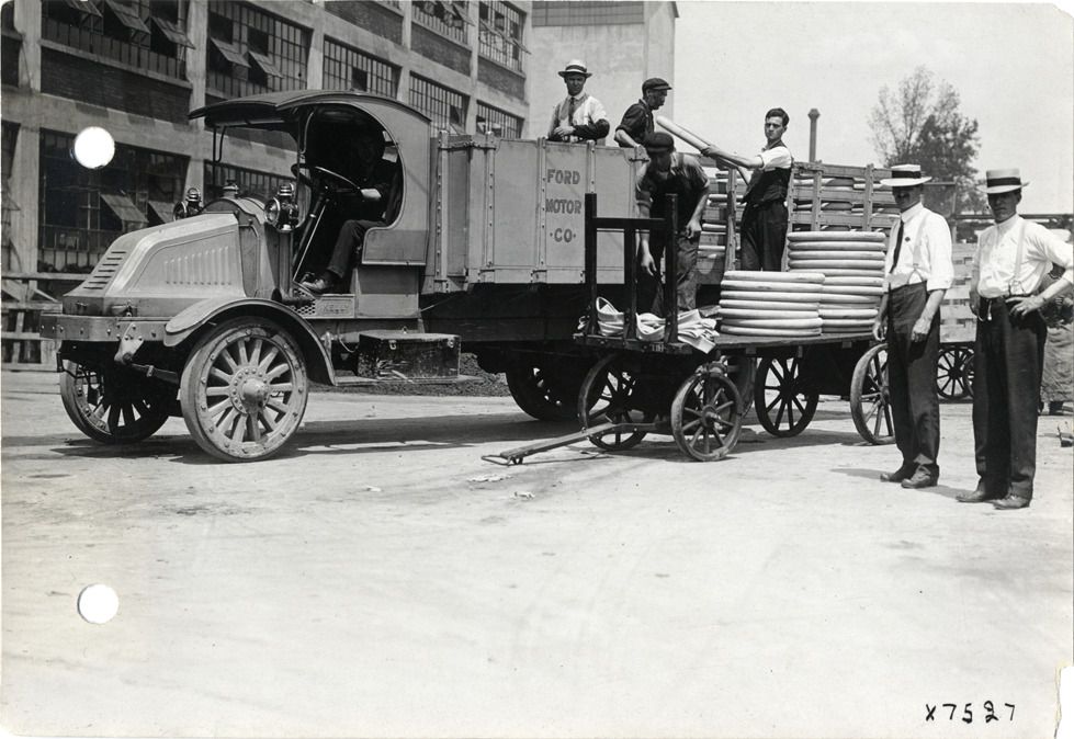Men unloading tires from Kelly-Springfield truck at Ford Motor Company factory