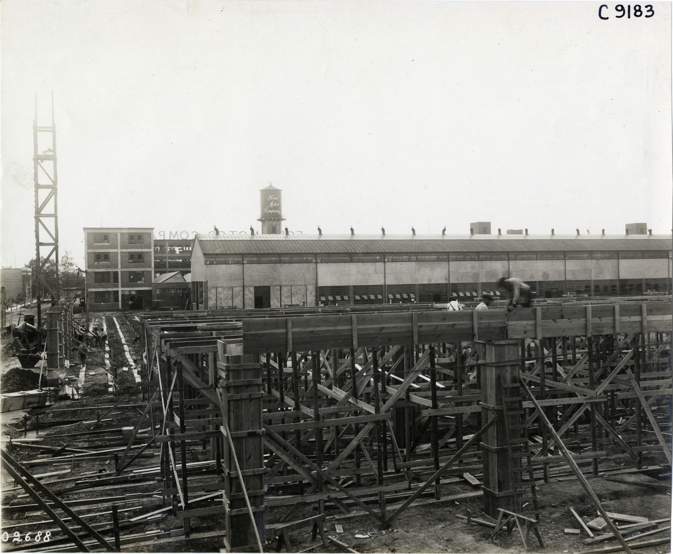 View of Ford Motor Company factory addition during construction; construction workers stand atop of building framework. Factory building behind construction; "Ford Motor Co." on water tower in background. Handwritten on back: "Factories--Ford Motor Co., 1911."