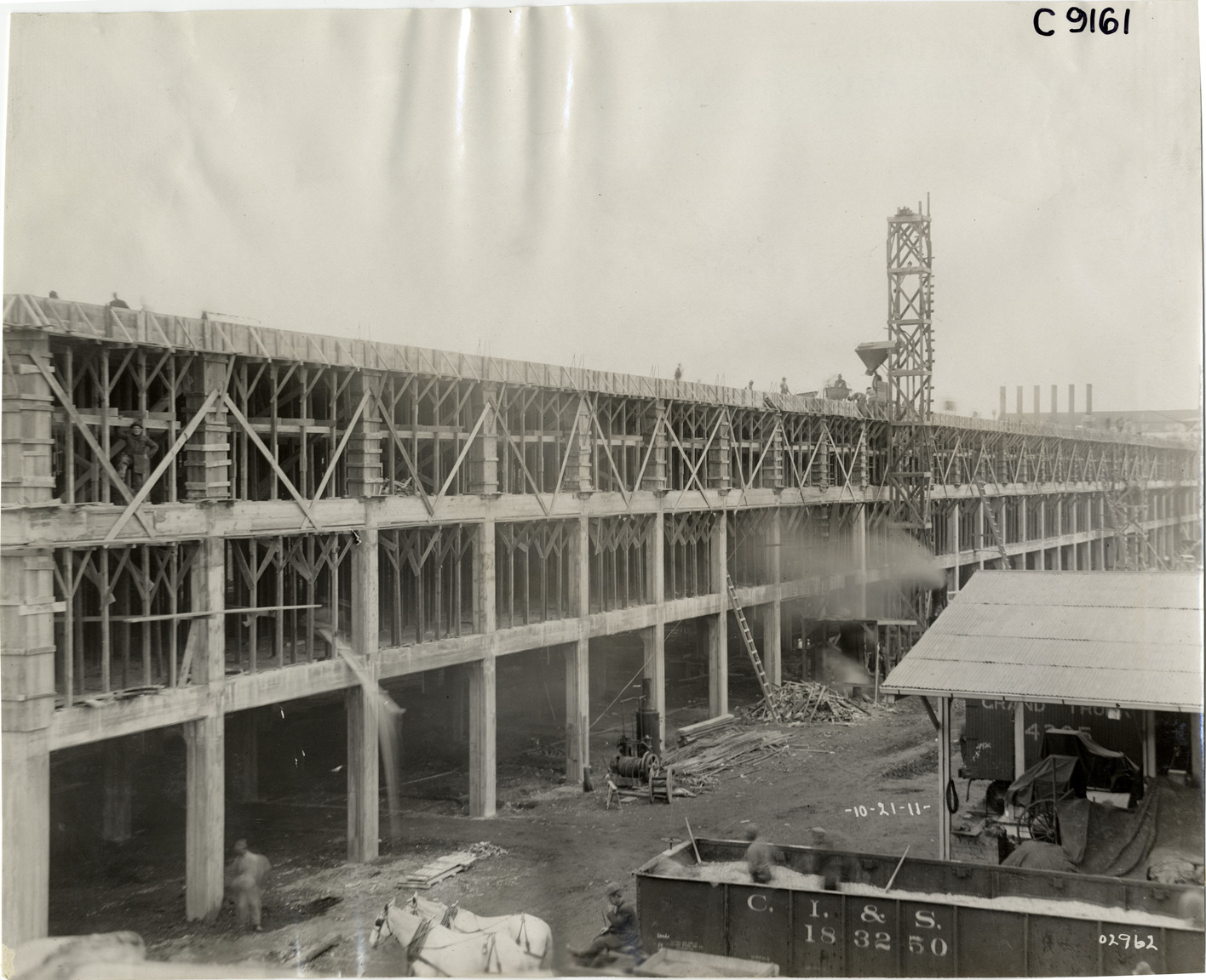View of Ford Motor Company factory addition during construction, showing building framework. Shed, horse-drawn wagon and railroad car in foreground. Handwritten on front: "10-21-11." Handwritten on back: "Factories--Ford Motor Co., 1911."