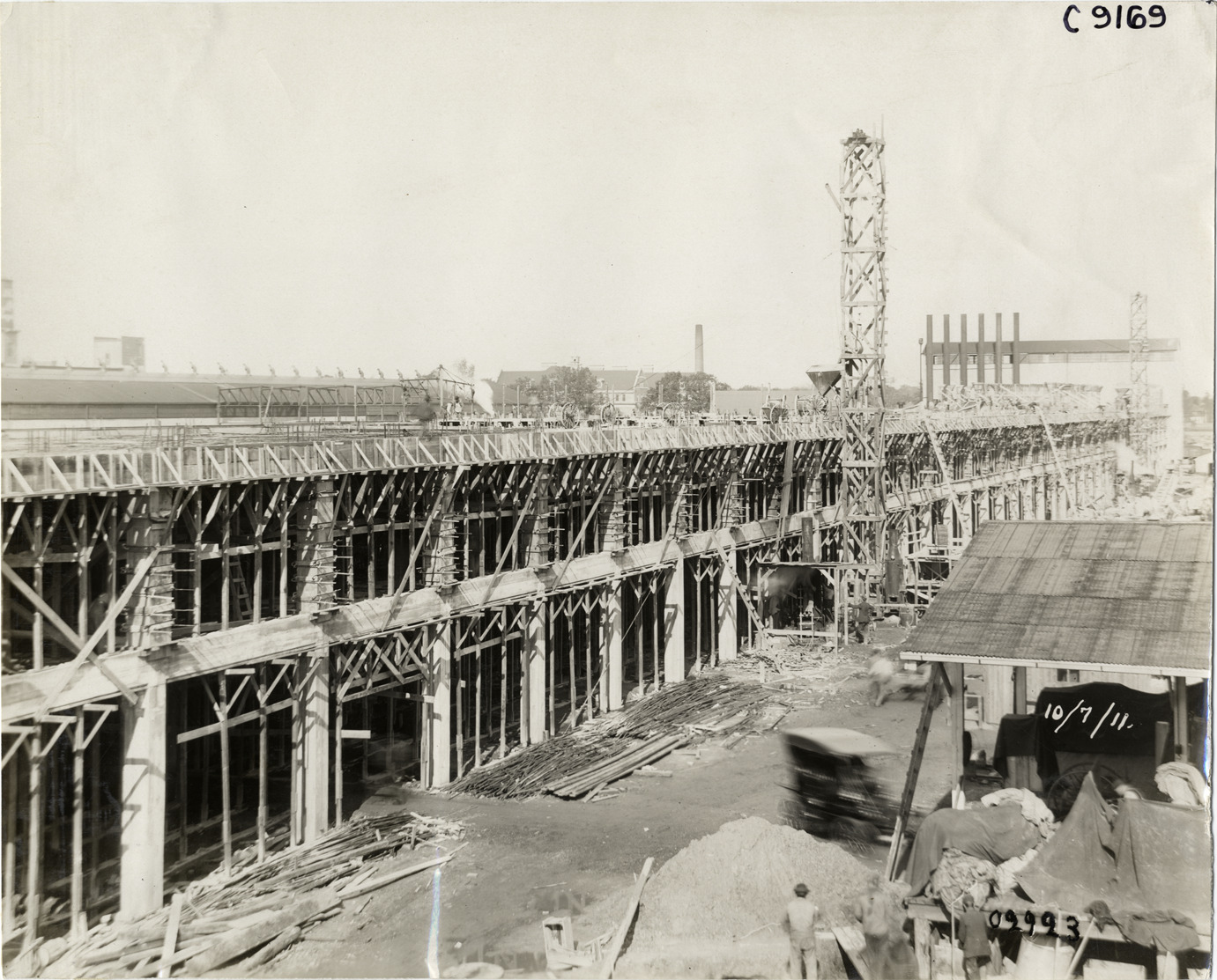 Favorite this☆ Ford Motor Company factory addition under construction Description: View of Ford Motor Company factory addition during construction, showing building framework. Handwritten on front: "10/7/11." Handwritten on back: "Factories--Ford Motor Co., 1911." Details Resource ID: na007068 Subject: Ford Motor Company Automobile factories--Michigan--Highland Park--Design and construction Buildings--Additions--Michigan--Highland Park--Design and construction Structural frames Photographic prints Date Issued: 1911-10-07 Format: 1 photographic print ; 7.5 x 9.25 in. Member of: National Automotive History Collection Lazarnick Collection Filing Location: Factories--Ford Motor Co. #1 Negative Number: Negative #C9169 Rights: Physical rights are retained by DPL. Copyright is retained in accordance with U.S. copyright laws.