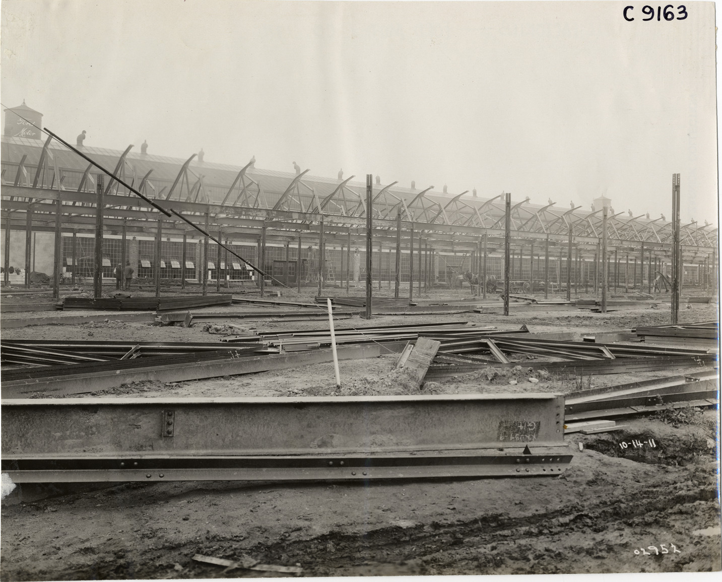 View of Ford Motor Company factory addition during construction; piles of beams in foreground. Handwritten on front: "10-14-11." Handwritten on back: "Factories--Ford Motor Co., 1911."