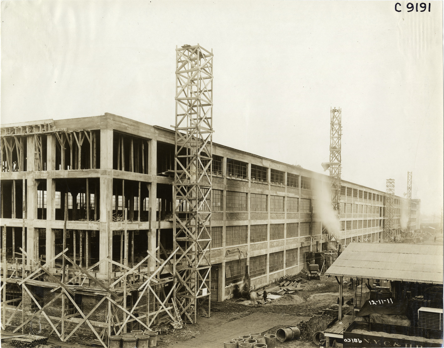 View of Ford Motor Company factory addition during construction. Scaffolding next to building; shed and building materials in foreground. Handwritten on front: "12-11-11." Handwritten on back: "Factories--Ford Motor Co., 1911."