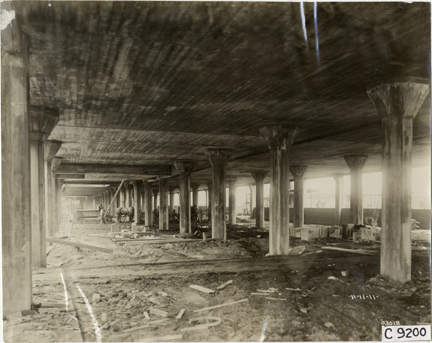 Interior view of Ford Motor Company factory addition during construction, showing building columns. Workers and horse-drawn wagon in background. Handwritten on front: "11-11-11." Handwritten on back: "Factories--Ford Motor Co., 1911."