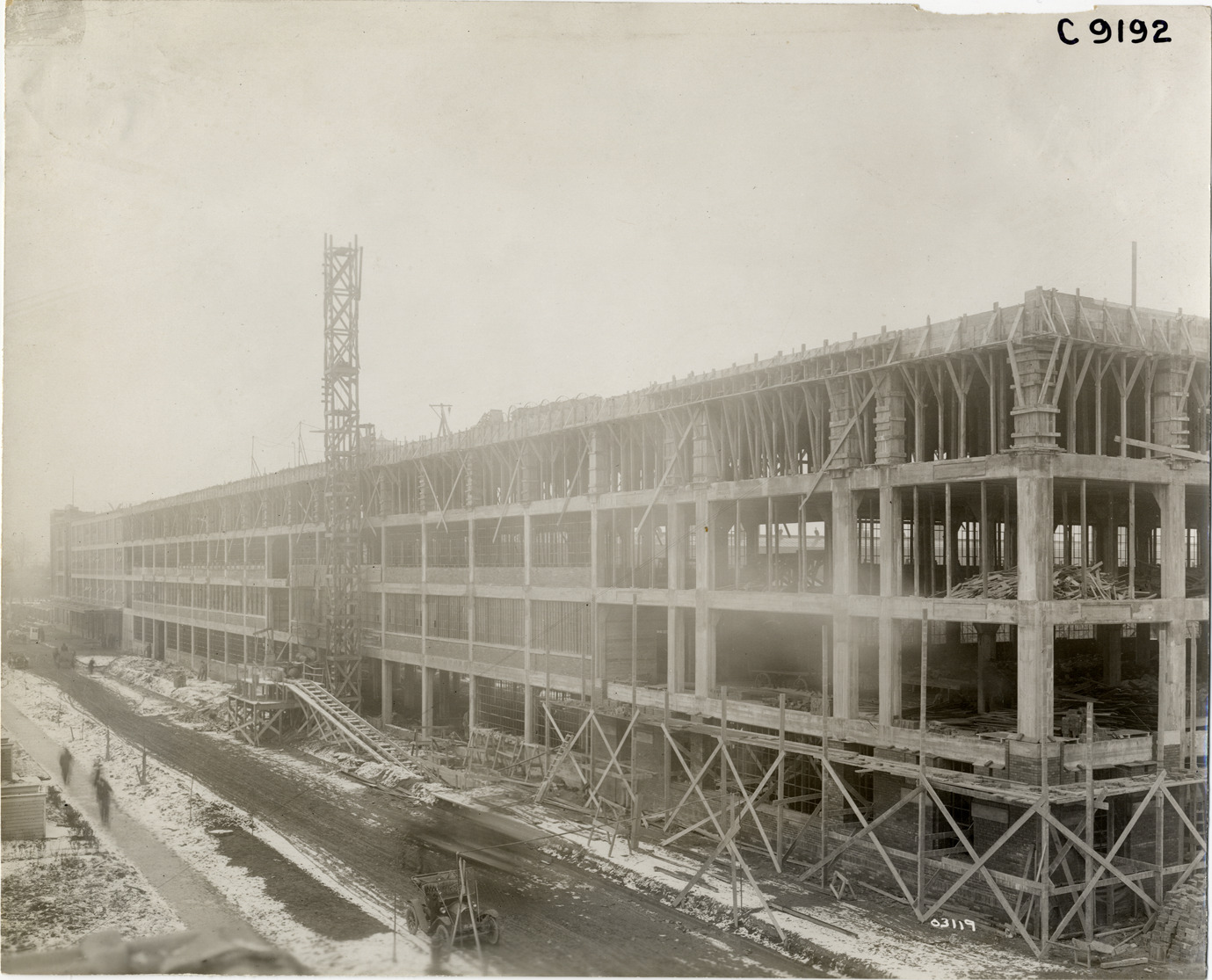 Favorite this☆ Ford Motor Company factory addition under construction Description: View of Ford Motor Company factory addition during construction. Scaffolding next to building; automobile in foreground. Handwritten on back: "Factories--Ford Motor Co., 1911." Details Resource ID: na007094 Subject: Ford Motor Company Automobile factories--Michigan--Highland Park--Design and construction Buildings--Additions--Michigan--Highland Park--Design and construction Scaffolding Photographic prints Date Issued: 1911 Format: 1 photographic print ; 7.5 x 9.25 in. Member of: National Automotive History Collection Lazarnick Collection Filing Location: Factories--Ford Motor Co. #2 Negative Number: Negative #C9192 Rights: Physical rights are retained by DPL. Copyright is retained in accordance with U.S. copyright laws.