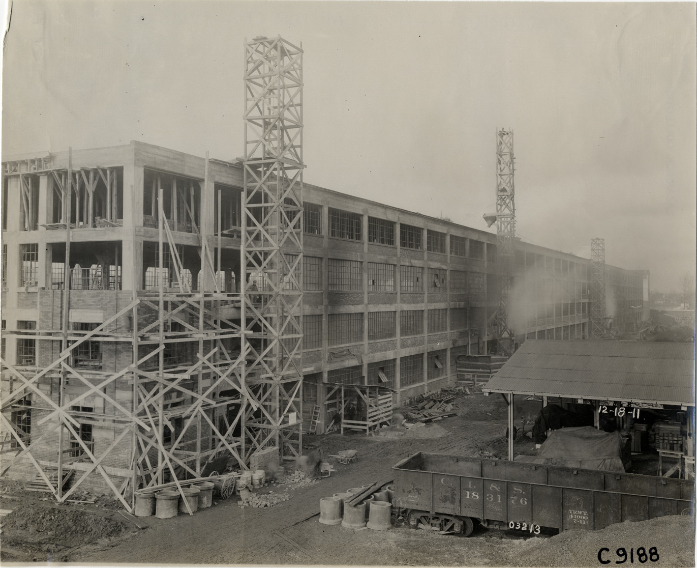 View of Ford Motor Company factory addition during construction. Scaffolding next to building; railroad car and shed in foreground. Handwritten on front: "12-18-11." Handwritten on back: "Factories--Ford Motor Co., 1911."