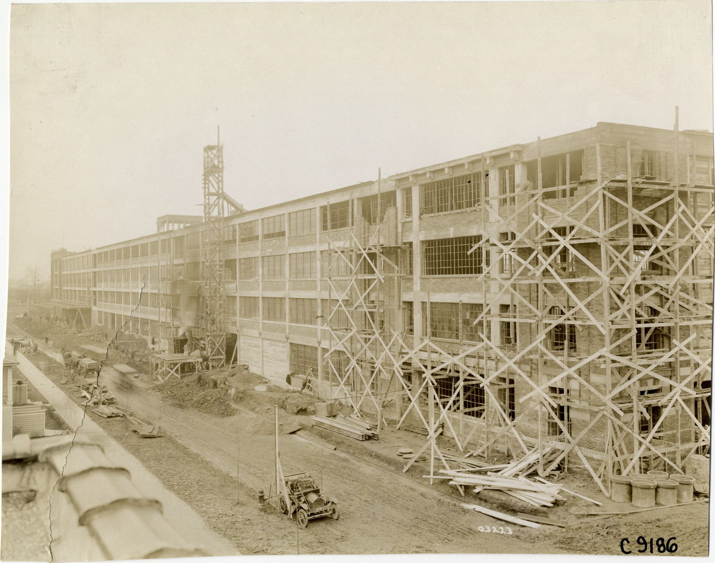 View of Ford Motor Company factory addition during construction. Scaffolding next to building; automobile in foreground. Handwritten on back: "Factories--Ford Motor Co., 1911."