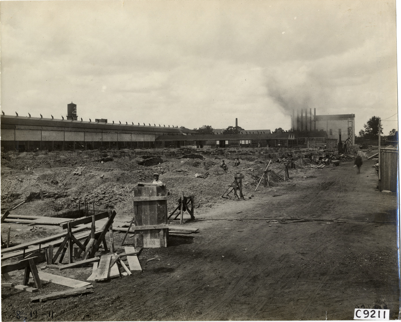 View of construction workers excavating site of Ford Motor Company factory addition. Handwritten on front: "8-19-11." Handwritten on back: "Factories--Ford Motor Co., 1911."