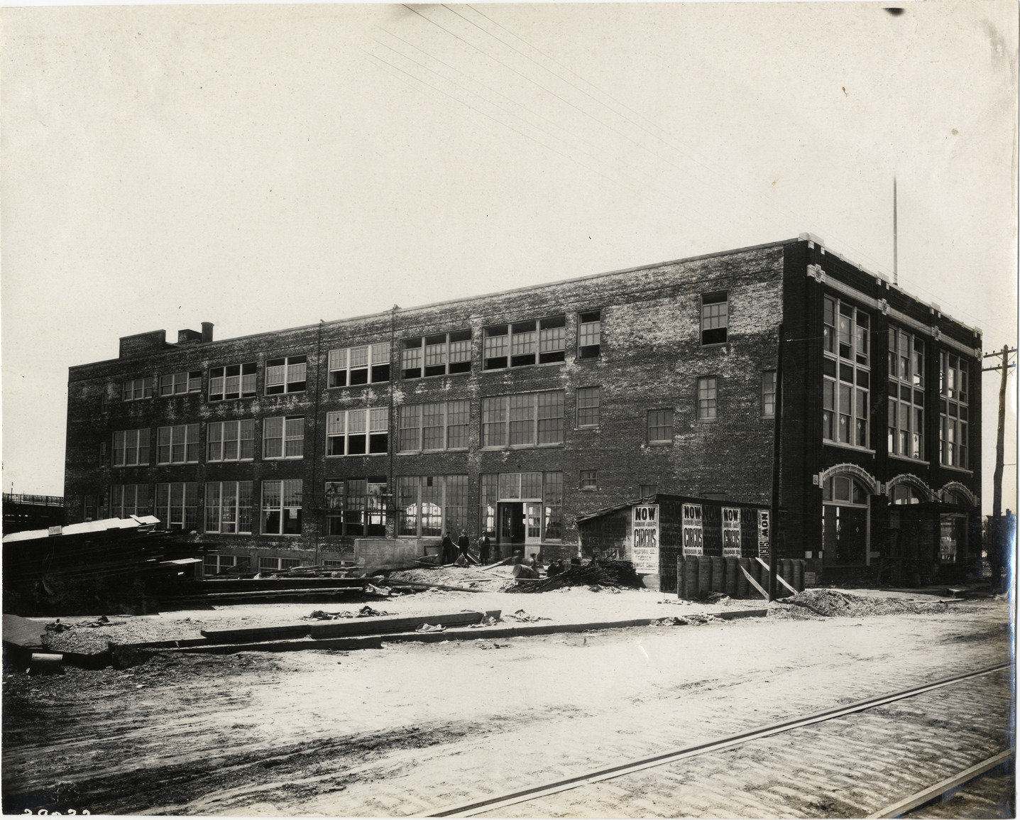 View of Ford Motor Company distributing plant and service depot building during construction; circus posters on shed adjacent to building. Stamped on back: "Spooner & Wells, Inc., photographers, telephones 3472-3473 Columbus, 1931 Broadway, New York." Handwritten on back: "Factories--Ford Motor Co., 1911."