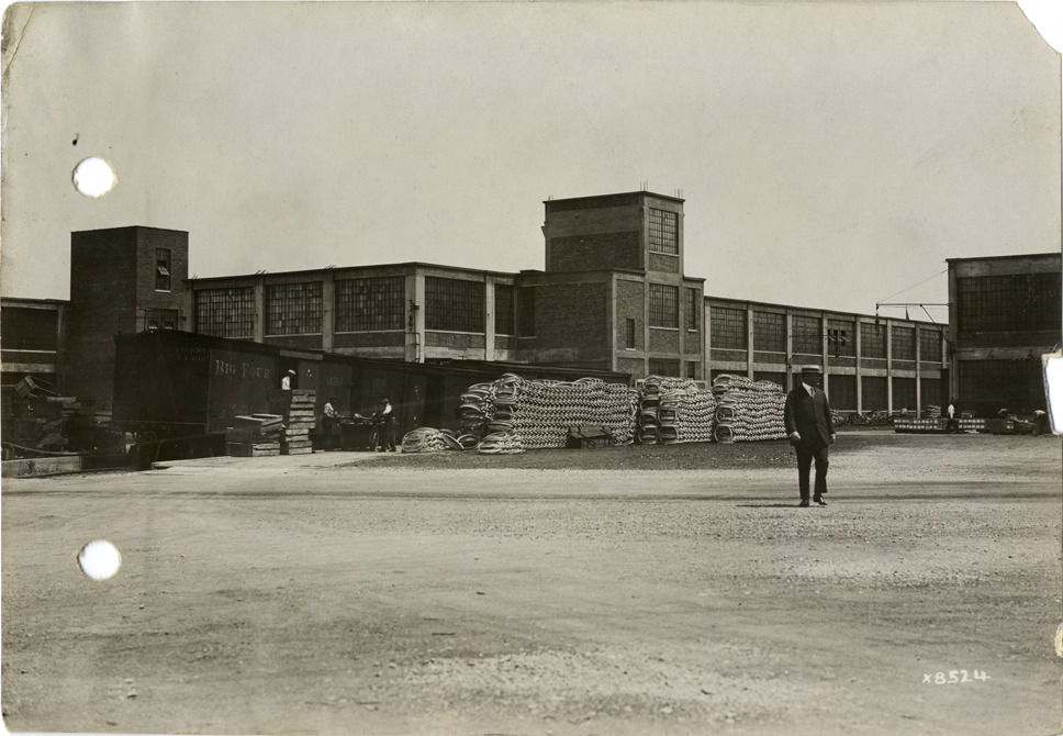 View of man walking in front of Hudson Motor Car Company factory. Stamped on back: "Spooner & Wells, Inc., photographers, 1231 Woodward Ave., Detroit, Mich., telephone North 1745." Handwritten on back: "Factories--Hudson. Taken at Hudson Motor Car Co's plant."