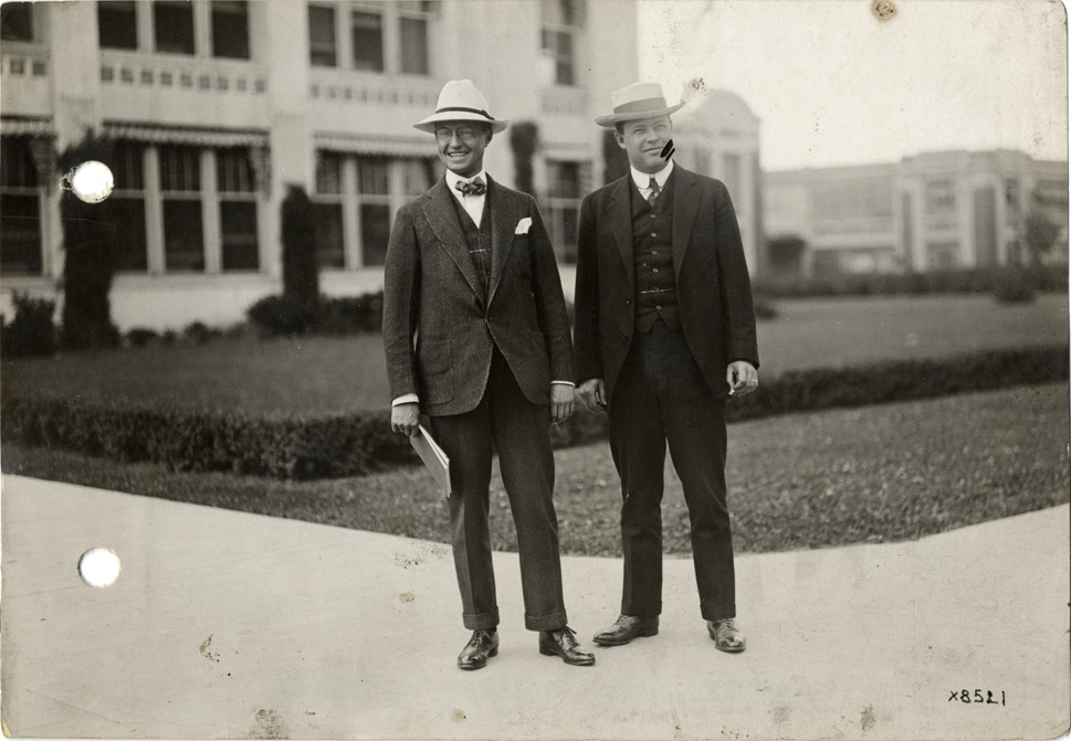 Portrait of two men, wearing suits and hats, standing in front of Hudson Motor Car Company factory. Stamped on back: "Spooner & Wells, Inc., photographers, 1231 Woodward Ave., Detroit, Mich., telephone North 1745." Handwritten on back: "Factories--Hudson. Taken at Hudson Motor Car Co's plant."