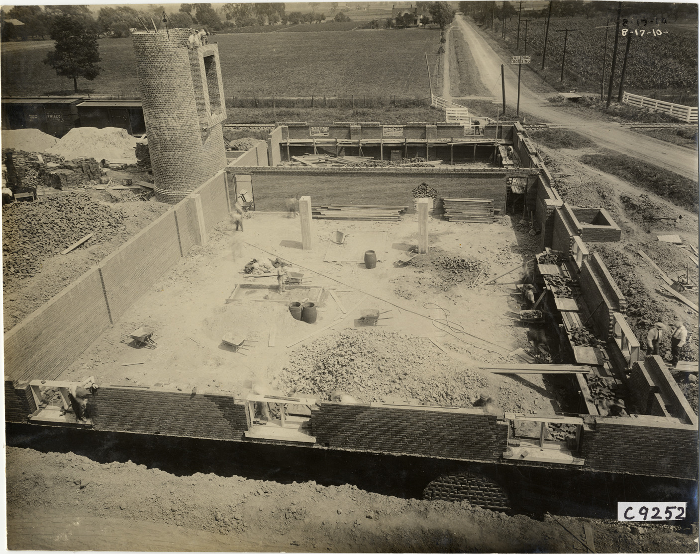 View of foundation construction of Lozier Motor Company factory. Fields and railroad crossing in background. Handwritten on front: "8-17-10." Handwritten on back: "Factories--Lozier, 1910."