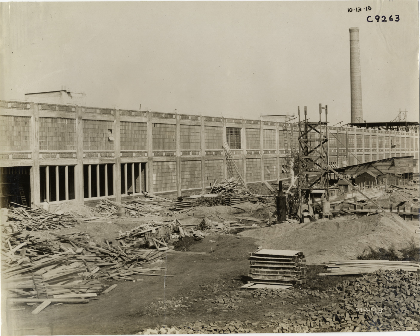 Favorite this☆ Lozier Motor Company factory under construction Description: View of Lozier Motor Company factory during construction, showing building framework. Construction materials and debris in foreground; smokestack in background. Handwritten on front: "10-13-10." Handwritten on back: "Factories--Lozier, 1910." Details Resource ID: na007190 Subject: Lozier Motor Company Automobile factories--Design and construction Structural frames Photographic prints Date Issued: 1910-10-13 Format: 1 photographic print ; 7.5 x 9.5 in. Member of: National Automotive History Collection Lazarnick Collection Filing Location: Factories--Lozier Negative Number: Negative #C9263 Rights: Physical rights are retained by DPL. Copyright is retained in accordance with U.S. copyright laws.
