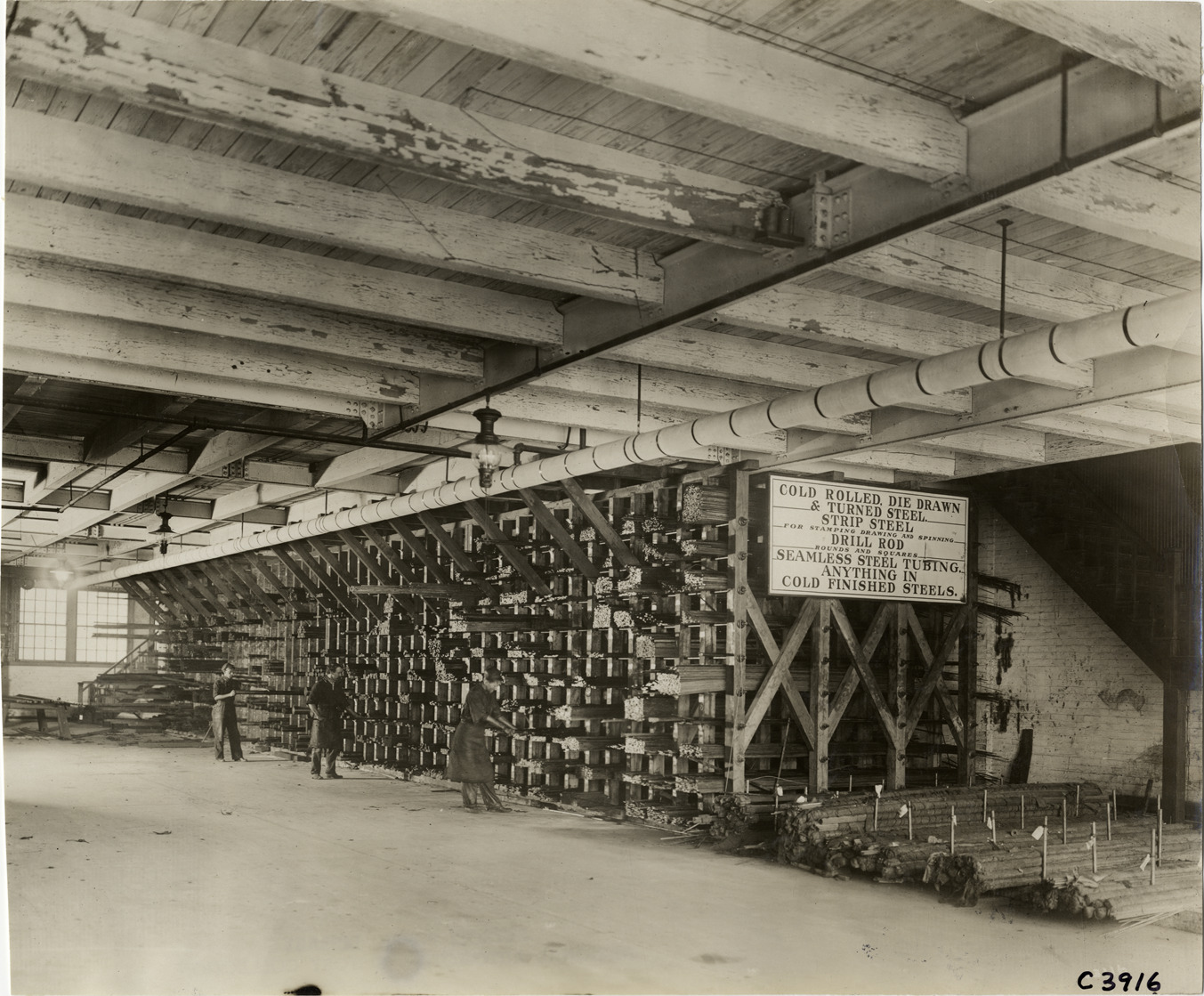 View of workers standing next to steel rods stacked in storage unit at Pittsburgh Shafting Company factory. Sign on end of storage unit: "Cold rolled, die drawn & turned steel. Strip steel for stamping, drawing and spinning. Drill rod, rounds and squares. Seamless steel tubing, anything in cold finished steels." Handwritten on back: "Factories--Pittsburgh Shafting Co., 1911."