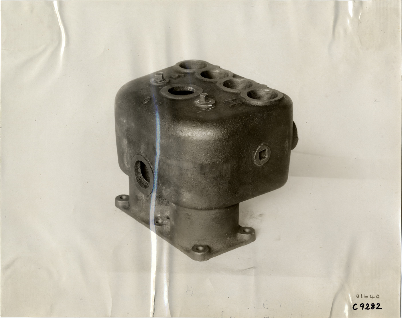 View of cylinder head manufactured by Massnick-Phipps Manufacturing Company. Handwritten on back: "Factories--Massnick-Phipps Mfg. Co., 1910. Cylinder head."